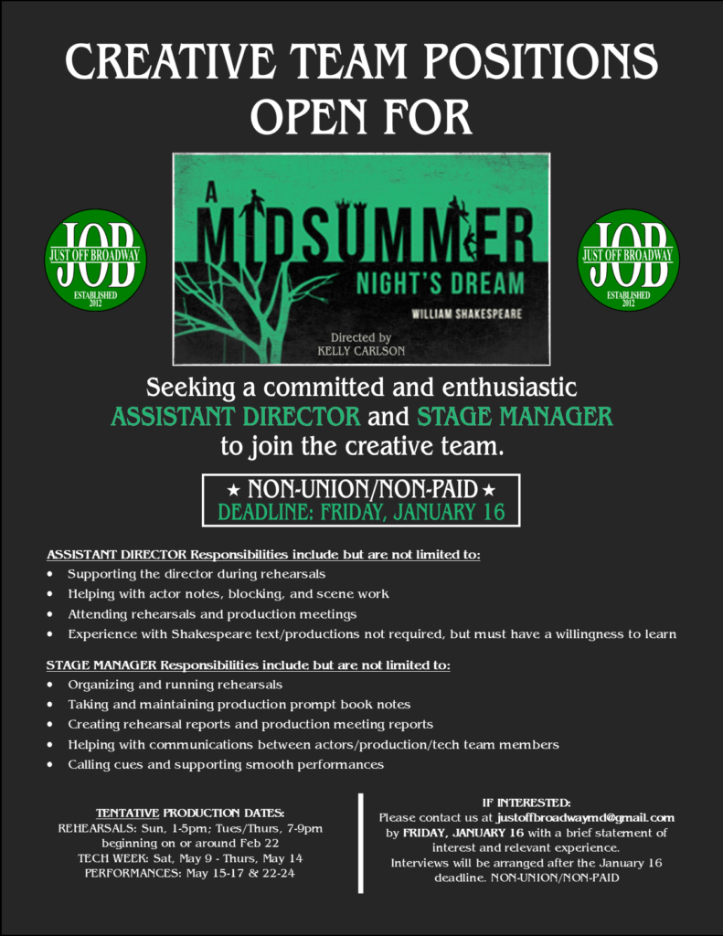 If interested, send an email with a brief statement of interest and relevant experience to justoffbroadwaymd@gmail.com!